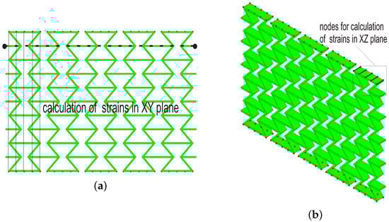 As given in Section 2.2.3, Equation (1) is used for Poisson’s ratio calculation of FE results. Figure 11 shows the lengths necessary for the Poisson’s ratio calculation, where results of Figure 11a are comparable with experimental ones (). Figure 11b is only to show that Poisson’s ratio in the XZ plane can also be deduced (), which is not used in this work. The horizontal direction (XX) is the loading direction, where it refers to Figure 10 for the coordinates. Only one strain value in the XX direction is necessary, since the strains are all the same, due to homogenous boundary conditions. Five pairs of nodes in each row are selected in the YY direction, and the strains in the lateral direction are deduced. At each deformed status, the mean value of the calculated strains (XX) is used for the structural Poisson’s ratio deduction. Shortly, the calculation of Poisson’s ratio for FE results is the same as the one used for measured data.