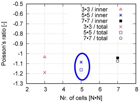 FE numerical proof of the 5 × 5 cells as the optimum one among auxetic structures with 3 × 3, 5 × 5, and 7 × 7 cells, taking ABS as the specimen material to show its independence of materials.