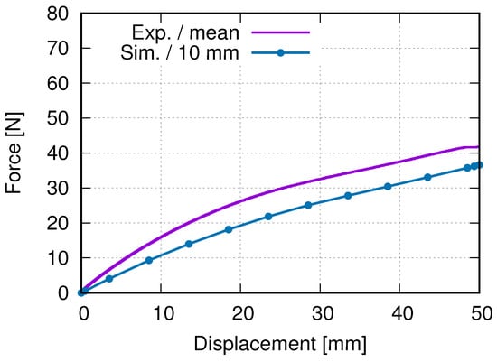 Experimental and FE-predicted force–displacement curves of PBAT auxetic structure with 5 × 5 cells.