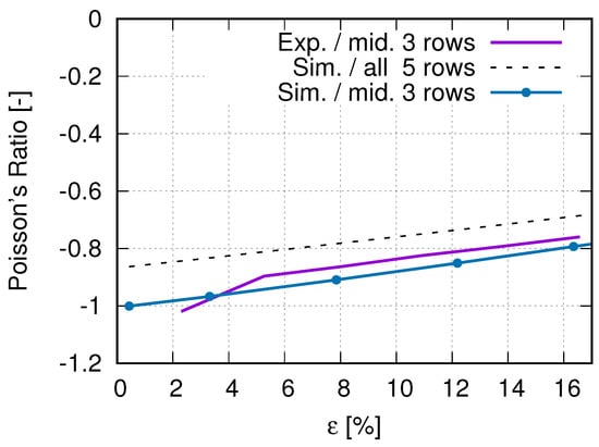 Experimentally measured and numerically predicted Poisson’s ratio development, according to loading for a PBAT auxetic structure with 5 × 5 cells. Experimental curve is reprinted from Ref. [40].