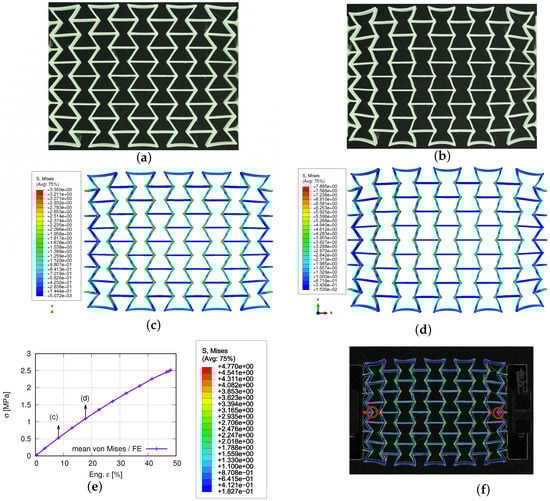 Experimentally measured and numerically predicted deformed status, according to loading for a PBAT auxetic structure with 5 × 5 cells: (a,b) measured at 8.8% and 17.6% strain, respectively; (c,d) FE-predicted von Mises stress at 8.2% and 17.8% strain, respectively; (e) FE-predicted mean stress evolution, according to loading; (f) comparison of deformed auxetic structure by overlapping experimental (gray contour) and FE results (colored area), where the legend only presents the FE result for the von Mises stress distribution.