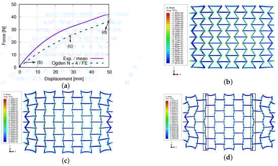 FE predicted von Mises stress and auxetic structure development, according to loading: (a) mean value evolution of von Mises stress, according to the (engineering) loading strain; (b–d) the deformed status of the auxetic structure at 3.37%, 27.42%, and 48.08%, (engineering) loading strain, respectively.