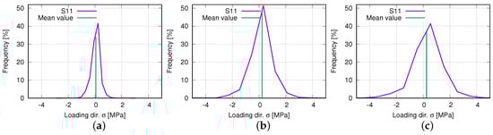 Figure 18a,c denotes the histogram of the loading direction stress (S11) at 8.18%, 27.41%, and 48.08% (engineering) loading strains, respectively. At low-loading strains (Figure 18a), the stresses concentrate in a small region, and the mean value is very near to zero MPa. The stress range enlarges according to the increased loading, which can be seen by comparing the widths of the curves in Figure 18a–c, but the mean value does not increase much. The slight mean value increment is caused by the nearly symmetric distribution of the histograms, which means the tensile and compressive stresses in the structure increase simultaneously and nearly symmetrically. As mentioned above, the mean value is compensated by the positive and negative stresses. The highest frequency also increases from 8.2% (Figure 18a) loading strain to 27.4% (Figure 18b), but decreases from 27.4% to 48.8% (Figure 18c). In the loading ranges with both the frequency increment and decrement, the stress inhomogeneity and (absolute) maximum stress increase. In the loading ranges with the frequency increment (Figure 18a,b), still, a large number of elements possess stresses near the mean value. While in the loading ranges with the frequency decrement (Figure 18b,c), more and more elements show a more significant discrepancy of the stress value to the mean value, which is accompanied by the exhausted auxetic deformation behavior.