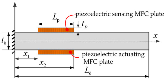 The piezoelectric sensing and actuating MFC plates are pasted symmetrically into the upper and lower surfaces of the cantilever beam, and their parameter information is shown in Table 1. The length of the cantilever is Lb, the width is b, and the thickness is tb. Furthermore, the length of the sensing/actuating piezoelectric plate is Lp, the width is the same as that of the flexible beam, and the thickness is tp. The distance between the left and right ends of the beam’s fixed end is x1 and x2, respectively.