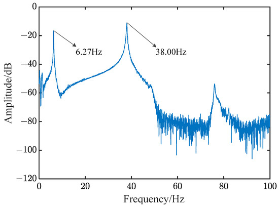 Since the vibration energy of the flexible beam is mainly distributed in the lower-order mode, the frequency sweep experiment is only used for the first two order modes of the flexible beam. The correct parameters for its use are as follows: set the frequency range of the sweep to 0–50 Hz, the sweep mode to linear, the signal amplitude to 5 V, the sweep time to 15 s, and the sampling frequency to 500 Hz. After the experiment, the output signal of the sensing piezoelectric plate is shown in Figure S3, and the frequency response curve is shown in Figure 2.