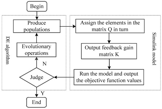 The differential evolution algorithm is combined with the Simulink model of the piezoelectric flexible beam system to optimize the weighted matrix Q. Because the objective function Jc is the minimum, the objective function Jc is used as the fitness function F. The process of optimizing Q using the differential evolution algorithm is shown in Figure 3.