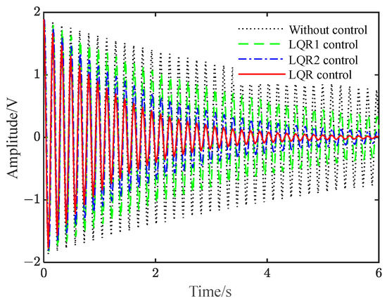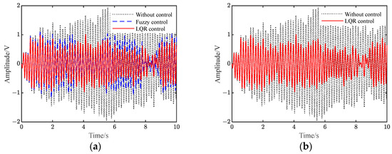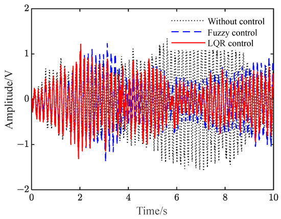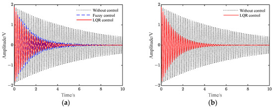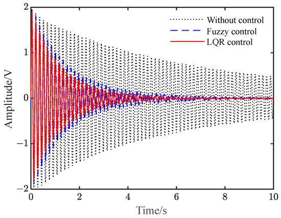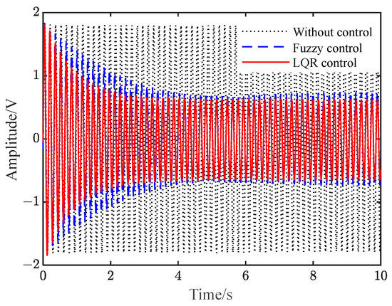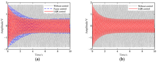 Figure S9 shows the voltage when applied to the piezoelectric plate under different controls. It can be seen from Figure 9 and Figure S9 that when there is no control, the vibration of the flexible beam is slowly attenuated. Additionally, after the two controls are applied, the amplitude of the flexible beam is quickly suppressed to a significant extent. Furthermore, the amplitude of the beam under LQR control is smaller than that under fuzzy control.