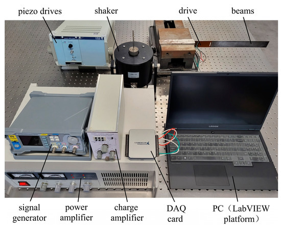 A structural diagram of the piezoelectric flexible beam active vibration control system is shown in Figure S8. Additionally, the system hardware experimental platform is shown in Figure 8. The system consists of a signal acquisition unit, an active control unit, a feedback actuation unit, and an excitation unit.