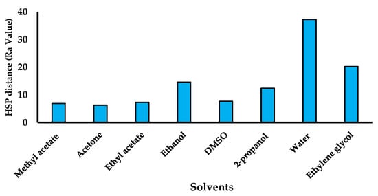 HSP based on cohesive energy, which comprises dispersion (atomic) force (δD), permanent molecular bipolar force (δP), and hydrogen bonding (δH) distance Ra value of the solvents, has been depicted in Figure 3. The order of solvents can be given based on the Ra value as follows: H2O > EtGlycol > EtOH > 2-PrOH > DMSO > EA > MeAt > ACTN. The soaking of filament in the selected solvent blend is depicted in Figure 1.