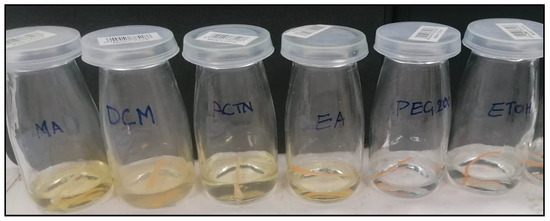 Based on the swelling index solvent blend composed of acetone—ethanol (27.8:18:2) and PEG 400 in 1:1 drug—PEG 400 solubilizer ratios were selected, and the filament SI% after 24 h was found to be 7.77. This solvent system was used for the soaking and drug encapsulation through PLA filament. The filament was soaked into the solvents, and weights of the swelling index (SI) of MeAt, DCM, ACTN, EA, PEG, and EtOH were found to be 3.12%, −100%, 7.85%, 20.12%, 1.08%, and 2.08%. The filament was slightly swelled in PEG 400 and EtOH and bulging in ACTN, MeAT, and EA. However, DCM completely dissolved the filament (Figure 2 and Figure 3). Therefore, DCM is unsuitable for soaking purposes, especially with PLA.