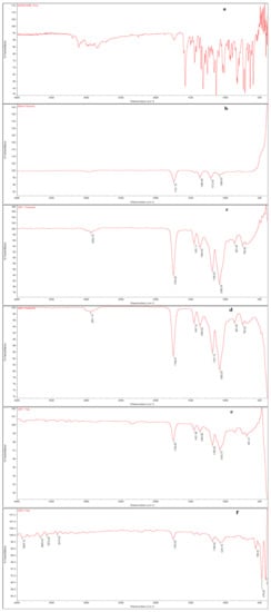 FTIR spectrums of (a) BAB, (b) PLA, (c) 3DP1, (d) 3DP2 filaments, and (e,f) for 3D pills fused with BAB.