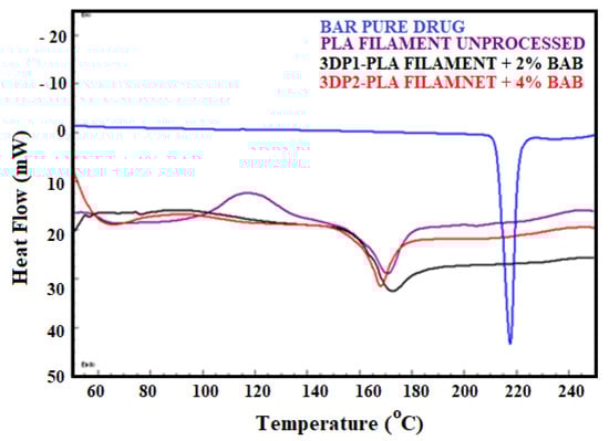 The thermogram of the unprocessed PLA filament showed exothermic peaks at 110.5 °C and endothermic peaks at 170.5 °C. Pure BAB represented a sharp endothermic peak at 217.5 °C. Slight shifts in the melting peaks of PLA observed in 3DP1 and 3DP2 pills (Figure 7) could be attributed to increased or decreased L-isomer and D-isomer content. Moreover, it has been reported that PLA has two forms—the α-form (orthorhombic, pseudo-orthorhombic, or pseudo-hexagonal) and the β-form (trigonal or orthorhombic). The α-form melts at higher temperatures, whereas the β-form melts at lower.