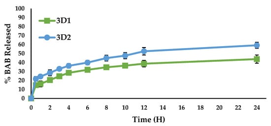 Drug release in studies with 3DP1 and 3DP2 pills composed of 22% and 37% BAB encapsulation in the filament was used to design the BAB oral pills. Both pills observed slight drug release bust effects due to the drug being completely encapsulated during the FDM heating process within the PLA. However, within an hour, 16.13 ± 1.45% and 24.37 ± 3.24% drugs were released, and the release noted were 44.76 ± 3.34%, 59.14.14 ± 4.54% up to 24 h from 3D1 and 3D2 pills, respectively. This pattern of release is desired to achieve the onset of action followed by the sustained effects of the drug for a prolonged period (Figure 8).