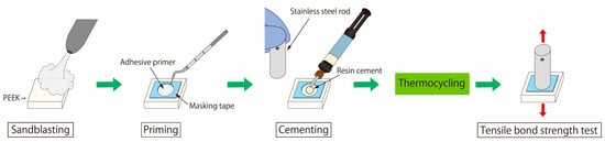 Despite its desirable properties, the appearance of PEEK is significantly different from that of natural teeth owing to its opacity and greyish pearly white color. When preparing a PEEK prosthesis, the color of the PEEK must be shielded by veneering with resin-based adhesive, which requires the use of adhesives. In fixed dental prostheses, PEEK is bonded onto the abutment teeth using an adhesive, which means that durable bonding between PEEK and the adhesive is indispensable to ensure that the prosthesis is stable over numerous years. However, the chemically inert nature and low surface energy of PEEK render adhesive bonding difficult. Thus, various surface-modification methods have been investigated to overcome these problems [8]. For example, alumina sandblasting (alumina airborne particle abrasion) can mechanically roughen the PEEK surface to increase the surface area, resulting in an improved bond strength [10,11,12].