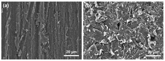 SEM images for the PEEK surfaces: (a) surface polished using emery paper and (b) alumina-sandblasted surface.