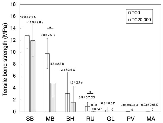 Mean and standard deviations of the TBSs of the various experimental groups. Different uppercase and lowercase letters represent statistically significant differences among the non-thermocycled (TC0) and thermocycled (TC20,000) groups, respectively. An asterisk indicates a statistical difference between the TBSs for the TC0 and TC20,000 groups for the same resin cement.