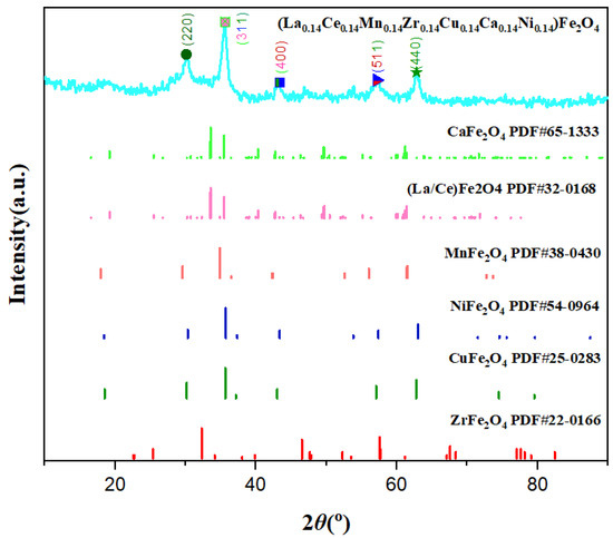 The composition and morphology of the high-entropy spinel ferrite were investigated by XRD, SEM, and EDS Mapping. Figure 3 shows the XRD patterns of (La0.14Ce0.14Mn0.14Zr0.14Cu0.14Ca0.14Ni0.14)Fe2O4 NFs and the standard PDF card patterns of , , , , , , and . Each characteristic peak of the high-entropy spinel ferrite matched the characteristic peaks of the spinel ferrite containing the element. For example, the five distinctive characteristic peaks when 2 was 30.1 correspond to the (220) crystal plane of , , and ; 35.5 corresponds to (311) crystal plane of , , , , , and ; 43 corresponds to (400) crystal planes of , , , and ; 57 corresponds to (511) crystal planes of and ; and 63 corresponds to (440) crystal planes of . Thus, the synthesized spinel ferrite contains La, Ce, Mn, Zr, Cu, Ca, Ni, and Fe.