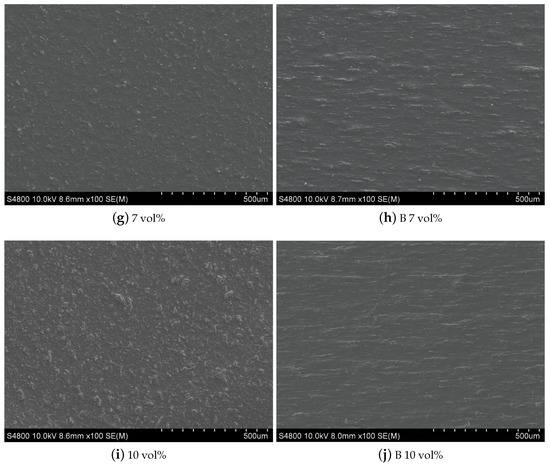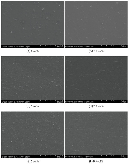 As shown in the lower part of Figure 2, B 1 vol%, B 3 vol%, B 5 vol%, B 7 vol%, B 10 vol%, 1 vol%, 3 vol%, 5 vol%, 7 vol%, and 10 vol% 7FO NFs of PVDF-based composite films were prepared using the conventional solution casting method. Here, B represents the magnetic field. A magnetic field strength of 0.8 T was applied to the film for 3 min. The magnetic field direction was parallel to the film plane.