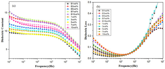 Therefore, when the content is B 7 vol%, the film has the maximum dielectric constant of 13.45 at 1 kHz. However, a magnetic field of 0.8 T induced for 3 min had the greatest effect on the content of the 3 vol% composite film with the strongest enhancement of the dielectric constant.