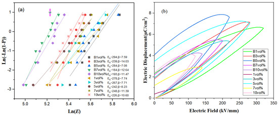 Figure 8a shows the characteristic breakdown intensities of ten thin film samples and their parameters. It can be seen that B 1 vol% 7FO/PVDF had a maximum breakdown strength of 294 kV/mm and B 3 vol% 7FO/PVDF had a maximum Weibull parameter of 14.03. The influences on breakdown strength include both intrinsic and extrinsic factors. The intrinsic factors are related to the band gap of the material, while the extrinsic factors are related to mechanical electrical breakdown due to over-limiting deformation caused by surface-bound charges and electrostriction effects, as well as to thermal breakdown due to heat and dielectric losses generated by leakage current exceeding its dissipation capacity [7,47].