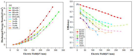 Figure 9a shows the discharge energy density of magnetic field-induced and non-induced 7FO/PVDF nanocomposite film materials, which can be calculated from the D-E hysteresis line according to Equation (1). The two samples with the largest discharge energy densities among the ten different films were B 1 vol% (5.41 J/cm3, 320 kV/mm) and B 3 vol% (6.23 J/cm3 280 kV/mm), both treated with the magnetic field. The overall discharge energy density of the magnetic field-treated films was larger than those without magnetic field treatment for the same doping ratio, indicating that the magnetic field enhanced the breakdown voltage, which in turn significantly increased the discharge energy density.