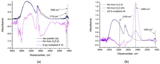 Regarding the differences among films from H2O before and after heating at 165 °C (see respective spectra in Figure 4c), a clear reduction of water content after heating is revealed from the intense negative peak at 1655 cm−1 (assigned to water bending vibration [25]) in the subtracted spectrum. Intense negative peaks in the C-H region (2800–3000 cm−1) are also observed along with various negative peaks in the O-H stretching vibration region (3100–3700 cm−1). In order to critically discuss these results, curve fitting (with Gauss peaks) was performed in the negative peak of the subtracted spectra ([Spectra of the film from D2O] − [Spectra of the film from H2O]) and ([Spectra of the film from H2O heated at 165 °C] − [Spectra of the film from H2O]). The fitted curves are presented in Figure 5, and the wavenumbers and percentage areas of the fitted peaks are presented in Table 2.