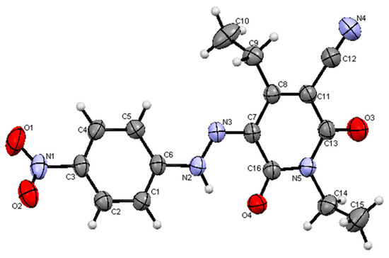 The interaction between diazonium chloride and pyridones was used as the initial reaction technique for the manufacture of these azo colors. In 2014 [46], using microwave irradiation at 160 °C for 20 min, we disclosed a three-component condensation of ethyl cyanoacetates 13, ethyl amines 14, and methyl propionylacetate 15 as ketoesters to produce pyridine-diones 16. It is crucial to remember that in 2013 [42], we produced compound 16 by conventionally heating it for 6 h (Scheme 3). The disperse dyes 18a–i that exist in the hydrazone tautomeric state can be produced by combining pyridine 16 and various diazonium salts 17 based on X-ray crystallographic structure determination, as indicated in Scheme 3 (Figure 2, Figure 3 and Figure 4).