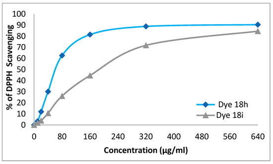 We utilized an in vitro assay to determine the two dispersive dyes’ antioxidant capacities and their capacity to scavenge DPPH free radicals. The antioxidant activity of the dyes was quantified using their IC50 values. According to the findings, disperse dye 18h had weak antioxidant activity (IC50) with a value of 191.6 and good antioxidant activity (IC50) with a value of 64.5 for disperse dye 18i (Figure 5).
