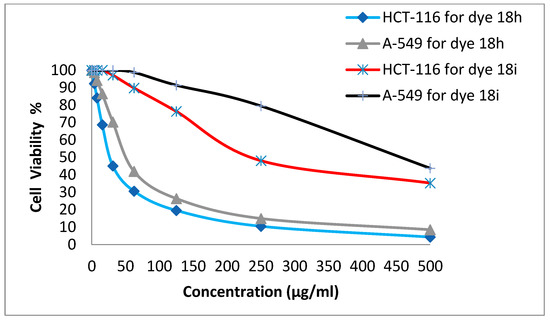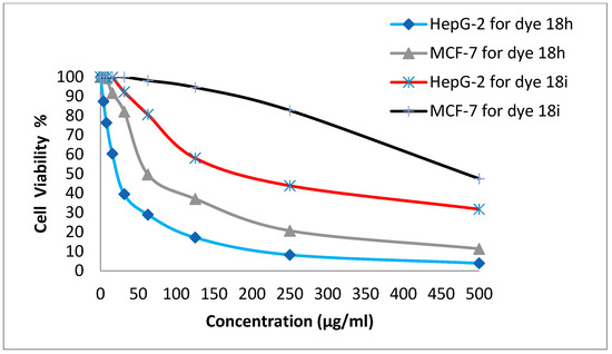 One of the most crucial biological assessments is cytotoxicity assessment since there are various in vitro methods of cytotoxicity of drugs [48], such as the inhibition of protein synthesis or the inhibition of permanent binding to receptors. Four human cell lines, including HepG-2 cells (for the treatment of hepatocellular carcinoma), MCF-7 cells (for the treatment of breast cancer), HCT-116 cells (for the treatment of colon cancer), and A-549 cells (for the treatment of lung cancer), were used to investigate the initial anticancer activity of the synthetic dyes 18h and 18i. Using various concentrations of the disperse dyes, the values of IC50—the concentration required to stop 50% of the development of the culture when cells are exposed to the tested disperse dyes for 48 h—were computed. Table 4 and Figure 6 and Figure 7 demonstrate the dye’s substantial activity for dispense dye 18 h, with IC50 values of 23.4, 62.2, 28, and 53.6 g/mL in the HePG-2, MCF-7, HCT-116, and A-549 cells, respectively. The IC50 values for disperse dye 18i, on the other hand, were 196, 482, 242, and 456 g/mL in HePG-2, MCF-7, HCT-116, and A-549 cells, respectively.