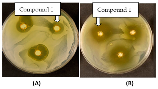 Candida albicans (A) and Staphylococcus aureus (B) treated with compound 1.
