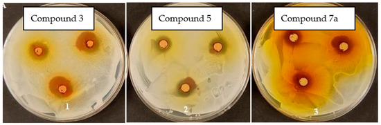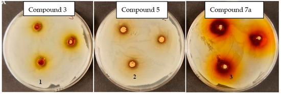 It should be noted that Figure 8, Figure 9 and Figure 10 illustrates how dyes No. 1, 3, 5, and 7a affect the cellular states of Bacillus subtilus, Staphylococcus aureus, and Candidia albicans. The inhibitory zone remained unchanged after a day of incubation.