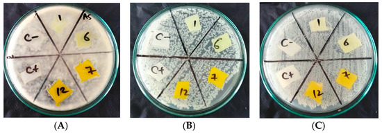 Aspergillus flavus (A), Bacilluscereus(B), and Staphylococcussciuri (C) treated with dyes 18h and 18i.