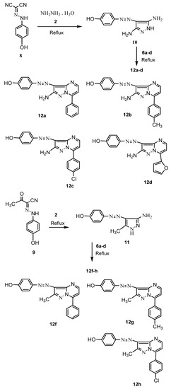 Hydrazine hydrate 2 was refluxed with compound 8 to produce dispersion dye 10 [44,45]. Disperse dye 11 was made by combining hydrazone 9 and hydrazine hydrate and refluxing the mixture for four hours while adding ethanol as a solvent. NOE (nuclear Overhauser effects) difference measurements show that irradiating the compound 11-corresponding NH signal at 11.94 ppm increased the methyl proton signal at 2.36 ppm. Dye 10 and dye 11 easily condensed with the enaminones 6a–d through refluxing for an hour in the presence of acetic acid and sodium acetate to produce disperse dyes 12a–d or 12f–h [45] (Scheme 2).