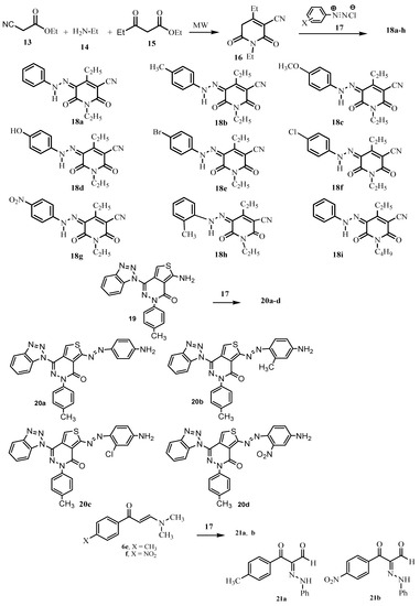 We were able to create unique, environmentally friendly disperse dyes in 2015 [57,58,59] (Scheme 3). In order to do this, we combined the phenyl diazonium salt 17a with the enaminones 6e and 6f in an acidic solution to create the mono azo disperse dyes 21a and 21b, which were 3-oxo-2-(phenylhydrazono)-3-p-arylpropionaldehydes.
