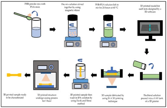 The SLA 3D printer fabricated a triplicate of samples for each composition of the PHB/PUA blend, with 8 s of exposure time at once. Then, the 3D-printed samples underwent a post-3D-printing process to clean up all the remaining uncured solutions that were left around the sample’s area using isopropanol (IPA). All the samples went through an ultraviolet (UV)-cured process by using a curing machine (Form Cure, Formlabs, Somerville, MA, USA) for 50 min at 60 °C. This postcuring process is able to enhance the mechanical performance of the samples by strengthening the bond linkage of the resin blends.