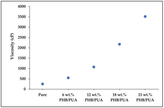 Various factors could affect the printability of SLA 3D printers, such as material deformation, mechanical control, postprocessing time and spot diameter [25]. However, in SLA, viscosity is the most essential factor that could influence the whole structure of the system [26]. Each commercialized resin has its specific viscosity, as stated in the material datasheet (MDS) of the resin product. As PHB powders were integrated into the resin structure of PUA, it directly evolves the structural properties of the resin. The viscosity of PHB/PUA blend resin increased with the additional amount of PHB composition, as shown in Figure 2. As PHB content increases in the composition, it tends to cause the resin to agglomerate, which greatly increases the viscosity of the resin.