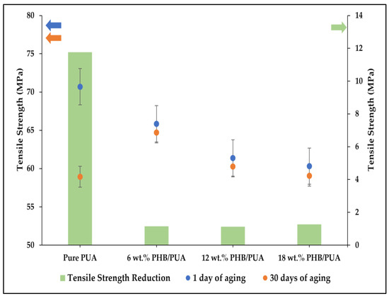 Despite this, the integration of PHB into the structure of the PUA matrix successfully retained the tensile strength value of the blend composites. Based on the change in tensile strength as shown in Figure 9, there was a huge loss of strength for pure PUA after a month of aging, with about 12 MPa of reduction value. However, the addition of PHB into the blend composites did not show any drastic loss of tensile strength value after a month of aging. Moreover, each composition of the PHB/PUA blend only recorded a decrease of below 2% compared with its initial tensile strength, which shows the capability of PHB to retain the strength of other polymer matrices.