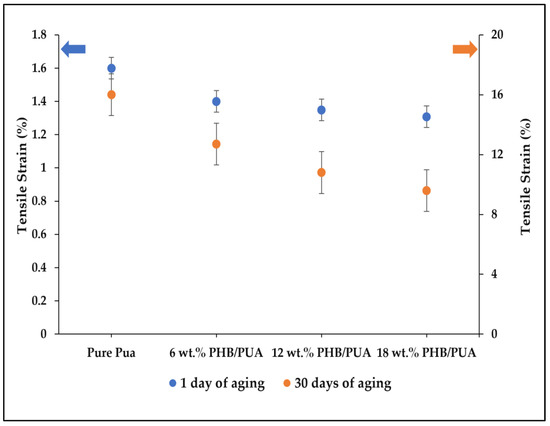 The tensile strain of various 3D-printed PHB/PUA compositions at different aging durations is recorded and illustrated in Figure 10. From the tensile strain result, it can be stated that the tensile strain slowly started to decrease with the increase in PHB powder content in the PHB/PUA blend compositions. The 18 wt.% of PHB/PUA blend recorded the lowest value of tensile strain at 1.31%, while the highest value of strain owned by 3D-printed pure PUA was 1.60%. The reduction in tensile strain occurred due to the low elongation of the filler, which later limited the elongation of the polymer blend matrix [47]. Consequently, the filler inhibited the polymer matrix’s capability to deform more than the composites’ overall deformation, thus resulting in a composite that is stiff but poor in ductility [48].