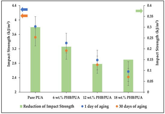 Impact strength value of various 3D-printed PHB/PUA compositions at different aging durations.
