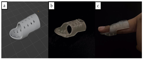 (a) Three-dimensional model design of splint; (b) 3D-printed splint; (c) 3D-printed split fitted well with the model’s finger.