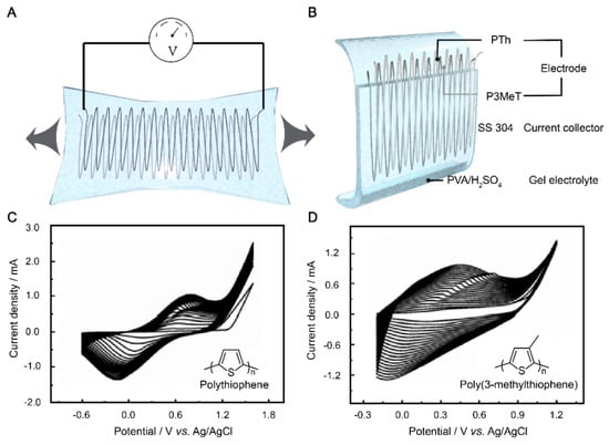 Owing to their superior electrical conductivity, processability, and environmental properties, conducting polymers have emerged as promising candidate electrode materials for the fabrication of flexible supercapacitors [45,46,47]. However, conducting polymers suffer from poor stability when used as electroactive materials due to their shape changes. Based on the requirement of a flexible supercapacitor, we designed SS 304 wire as a current collector and PVA/H2SO4 as a gel electrolyte to protect a conducting polymer electrode consisting of P3MeT and PTh. The use of PVA as a matrix material for the gel electrolyte is advantageous due to its high water retention ability, low toxicity, and excellent biocompatibility. Additionally, H2SO4 was added to the PVA matrix to enhance its ionic conductivity. H2SO4 dissociates in water to form H+ and SO42- ions, which can act as charge carriers in the electrolyte. The resulting PVA/H2SO4 gel electrolyte exhibited excellent mechanical stability, good ionic conductivity, and high compatibility with the electrode materials. First, thiophene and 3-methylthiophene were electrochemically polymerized on the pre-engineered stretchable SS 304 wire, respectively. The electrodes were then placed in a precursor solution of PVA/ H2SO4 and then condensed into a solid gel electrolyte to further prevent PTh and P3MeT from falling off the SS 304 wire during the stretching cycles (Figure 1B).