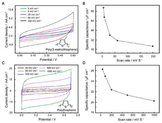 The electrochemical behaviors of P3MeT and PTh were further explored in a three-electrode system. The different behaviors were correlated with electrochemical kinetics, and the two electrodes were studied by CV at various scan rates (5–200 mV s−1 and 30–1000 mV s−1). Compared to the shape of the CV curves, there was a change in peak height at low scan rates for both electrodes, accompanied by a positive shift in the oxidation peak potential and a negative shift in the reduction peak potential (Figure 2A,C). These changes are mainly attributed to the resistance of the electrode. The areas enclosed by the CV curves increased with the scan rates of all electrode samples. On the one hand, the two electrodes were found to reach the highest capacitance at 0–0.7 V, which is in line with most reports on supercapacitor electrode materials based on polythiophene conductive polymers. On the other hand, the symmetric rectangular behavior of the two different electrodes indicates an extremely rapid current response on voltage reversal.