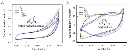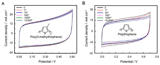 CV curves of P3MeT (A) and PTh (B) stretchable electrode after 10,000 cycles of strain at 100% with PVA/H2SO4 gel electrolyte protection.