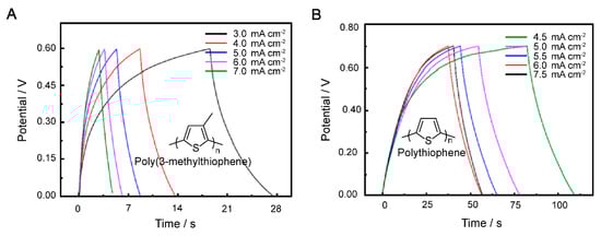 GCD curves of P3MeT (A) and PTh (B) at 3–7 mA cm−2 and 4.5–7.5 mA cm−2, respectively.