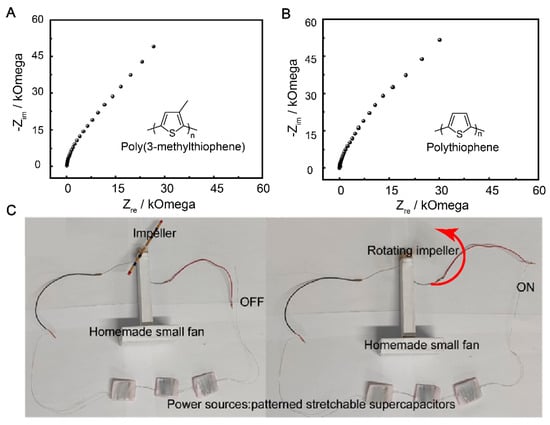 The use of flexible supercapacitors has been gaining popularity due to their potential applications in portable devices and other flexible and conformable applications [51]. The choice of SS 304 wire as a current collector in the fabrication of the flexible supercapacitor device is significant, as it possesses good conductivity and corrosion resistance properties. The flexible supercapacitor device was fabricated using P3MeT and PTh as the negative and positive electrodes, respectively, in a PVA/H2SO4 gel electrolyte. The Nyquist plots of the P3MeT and PTh electrodes show excellent capacitive behavior, with the EIS plot slope approaching 90° in the low-frequency region (Figure 6A,B). This indicates the promising performance of the device in terms of energy storage capacity. The potential practical application of the flexible supercapacitor device was demonstrated by connecting three devices in series to rotate a fan (Figure 6C). This emphasizes the scalability and adaptability of the device for use in various electronic applications. Overall, the use of flexible supercapacitor devices with the PVA/H2SO4 gel electrolyte, P3MeT and PTh electrodes, and SS 304 wire as a current collector provides a promising platform for the development of efficient, reliable, and flexible energy storage systems with a wide range of potential applications.