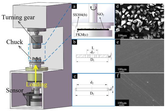 Schematic descriptions of (a) sliding friction pairs, (b) SS304 disc, (c) FKM ring, and SEM micrographs of (d) SiO2 particle, (e) metal disc, and (f) FKM ring.