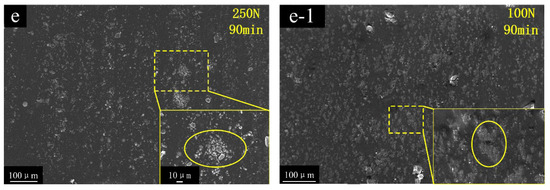 The changing process of abrasive particles from 15 min to 90min under the load of 250 N (a–e) and 100 N (a-1–e-1).