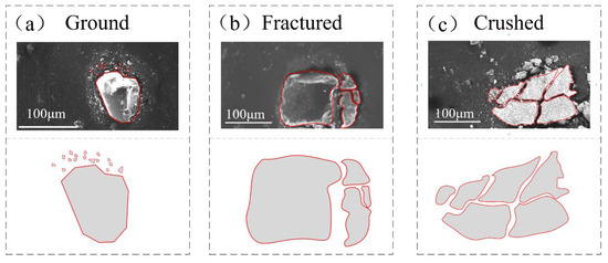 Typical particle breakage forms of (a) ground, (b) fractured, and (c) crushed.