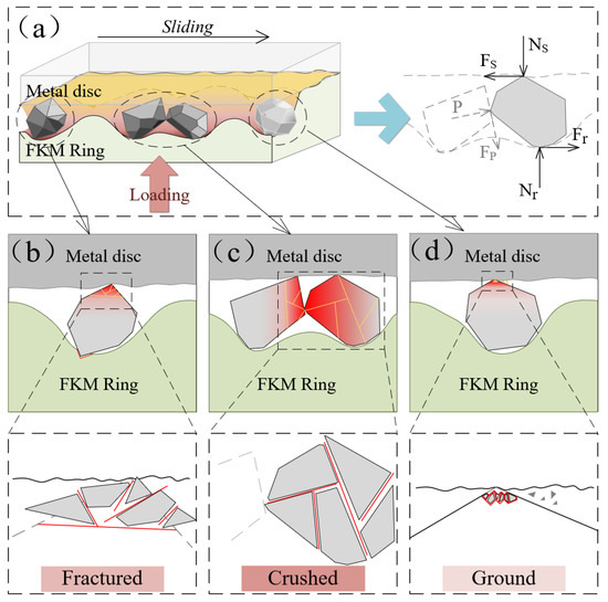 The detailed fracture mechanism of the individual particles is depicted in detail in Figure 4b. In the case where the rubber is deformed by compression, the sharp edges of the particles easily penetrate and stick-shear the rubber surface. Meanwhile, the particle slid and rubbed against the metal surface under Fs force. Under small pressure, the deformation contact areas between the particle and rubber are relatively small, which indicates that the particle is sheared and ground under small Ns and Fs forces and is rarely crushed. Under larger pressure, the contact areas between particle and rubber enlarge, and the Nr and Fs forces increase. Further compression and shear may also lead to fractal flake or fine due to greater friction and shear forces, forming partial fracture [21]. The particles squeeze against each other, resulting in a tightly interlocked and embedded particle structure, which also intensifies the extrusion and surface sliding friction against the metal surface. All of these increases the forces P and Fp, which tend to lead to partial fracture of particles. When the compressive forces P and shear forces Fp are large enough, particles have partially broken into pieces of bulks or split [22].