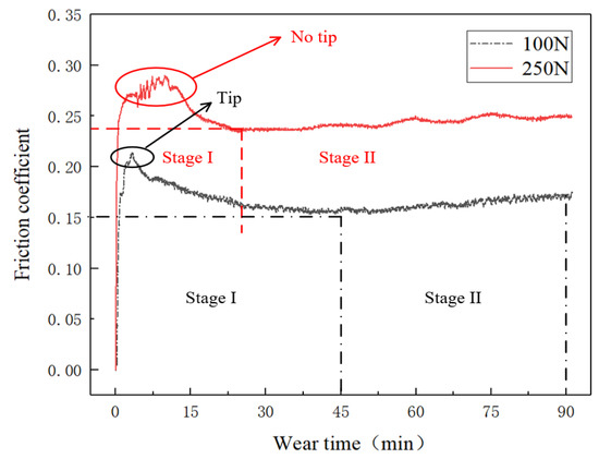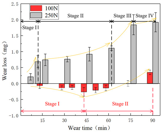 Time-variable mass loss of SS304 under the load of 100 N and 250 N.